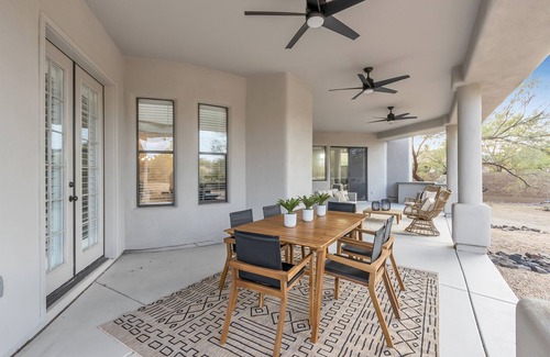 Step outside to your covered outdoor oasis, equipped with a dining area, a lounge, and a gas grill, perfect for entertaining. This serene space backs up to a natural Sonoran Desert wash where local wildlife like javelinas, roadrunners, and even the occasional coyote or bobcat family can be spotted.