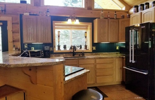 This log cabin features many large windows and indirect lighting casts a soft glow on the logs at night for a very relaxing feel. Living room also has an overhead light and large ceiling fan. The cabin also features custom lights throughout. Each bedroom has an overhead light and ceiling fan. A dual water heating system assures you of unlimited hot water. Front deck propane fire pit, back deck propane BBQ and back yard fire pit all included.