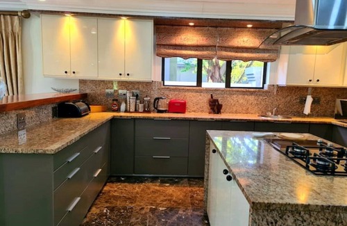 This is a Special Place to unwind. 5 Super Luxury Spacious Bedrooms with views of Mountains & Golf Course. The accommodation is for quiet family enjoyment and no parties allowed due to the residential nature of the location of the home. Spacious double volume open tranquillity with roaming wild game antelope and koi pond in immediate surrounds with beautiful views of the Mountains bordering the most picturesque part of the plush green golf course with an adjacent dam with fish and bird life. Hi speed wifi