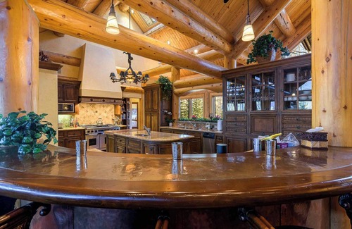 Welcome to Log Out at Touchdown, hosted by InvitedHome. This exceptional log, timber, and stone estate beholds a dramatic winding drive opening to a large porte-cochere that frames a set of grand, hand-carved wooden doors. The magnificent doors lead into the expansive Great Room and main living space which integrates a Gourmet Chef's Kitchen equipped for all culinary needs and a dining room with generous space and custom furnishings to comfortably accommodate all. This five bedroom, six and a half bath home was built for lush mountain living. Also on the main level, the exquisite and expansive main suite has a grand king bed, gorgeous golden-hued timbers with skylights, expansive views, a pop-up television and a huge fireplace with plush reading chairs. Additionally, the main suite has two separate and fully-functional work areas, perfect for a work-from-home space. Still on the main floor, there are two spacious guest rooms both with king beds and ensuites, one with a steam shower. Traverse down an elegant winding staircase to the family room, which includes a separate fireplace, media room, pool table, air hockey and foosball – fun for the whole family. Another downstairs guest room with wraparound views has two queen beds with an ensuite. Lastly, the bunk room has six bunk beds with four extra-long twins and two regular twins, a desk for two and an ensuite with a trough sink and double shower. Mudroom for all skis and gear can be stored, with a boot warmer with easy access. The home has fiber optic internet service with excellent Wi-Fi coverage for ease of use for work or school.