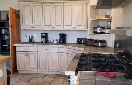 A kitchen that has lots of room for food preparation. A large commercial gas stove, with convection oven, large refrigerator in kitchen and another fridge in pantry.