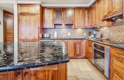 The spacious layout features two elegantly appointed bedrooms, including a master suite with en suite bathroom, and a guest room, accommodating up to six guests comfortably. The fully equipped gourmet kitchen boasts high-end appliances and ample counter space, making it ideal for preparing meals with fresh local ingredients. The open-concept living and dining area flows seamlessly onto the lanai, creating an inviting space for family gatherings or quiet evenings in.