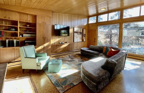 This home is an original Midcentury Modern designed by Japanese-American architect, Siberius Saito. One of the few homes in Cedar Falls designed by Saito. Original wood paneling, cork and tile floors, cabinets make this a must-stay home in the Cedar Valley. Nearly all of the furniture was picked from the period this home was built to perfect match the original Midcentury Modern feel of the home.