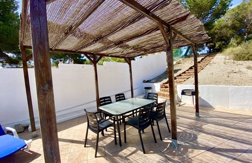 Superb Detached beach villa located in Urbanisation Rio Mar with large private swimming pool and garden area and only 10 minutes walk to the beaches of Mil Palmeras The villa is detached, there are 3 bedrooms (sleeps 6 to 8 guests) , 2 Bathrooms, A spacious living room with Air con and dining area, kitchen with main appliances (Inc dishwasher) . Outside to the rear of the villa is a shaded dining area with table and chairs plus charcoal BBQ area, perfect for dining al fresco , stairs lead up to the main pool there is a large private swimming pool (10 meter x 5 meter) 6 Sun beds to relax and chill around the pool area . shaded Gazebo with dining area next to the pool, WIFI Internet installed , Smart TV plus UK TV with English channels