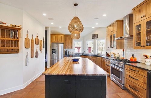 The impressive 6BR, 5.5BA St. Michaels waterfront getaway has recently been remodeled throughout with your comfort in mind. The open floor plan features a modern interior and provides large entertainment spaces. No expense was spared in this chef-inspired kitchen that comes equipped with dual ovens, wine fridge and island with butcher block countertop.