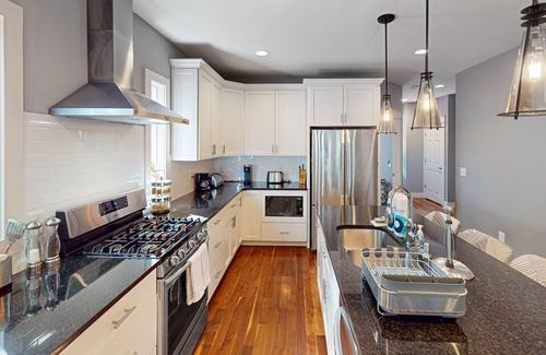 On your next trip to Music City, call this centrally located townhome your home away from home! Surrounded by lush green landscaping and minutes away from Downtown, this serene stay offers the best of both worlds - city living in a comfortable and quiet atmosphere. Walking inside, you will instantly take notice of the open-concept layout. Sit back and relax on the comfortable seating in the living room, or show off your culinary skills in the full kitchen featuring a center island and stainless steel appliances. The townhome's bedrooms are equally spacious and inviting with high-quality linens and central air-conditioning. Remote workers will appreciate the designated work desk located in one of the bedrooms. A private washer/dryer rounds out the stellar interior perks. Outside, enjoy tree-top views from the home's balconies. Sit back and swing on the hammock with your vacation read or fire up the provided gas grill.