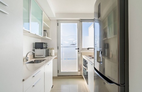 It features a living-dining area with a comfortable sofa and a Smart TV, a bedroom with a queen-size bed, a fully equipped kitchen, and a bathroom. Notably, there are two balconies with an amazing view of Av. Libertador. Inquire about parking for cars and motorcycles.