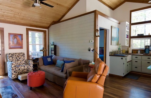 Stunning modern designer cabin just 10 miles from Lassen National Park. Perfect for families or couples seeking mountain adventure. Relax by the sleek wood stove, cook in a fully equipped kitchen, practice yoga in the loft studio, or unwind on the deck among towering pines. Snowshoe and Cross-country ski trails 5 minutes away in winter. Your contemporary mountain sanctuary awaits!