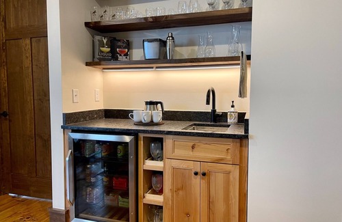 New to the rental market in spring of 2022, Golden Eagle Landing is a modern mountain home at the edge of Leatherwood Mountains Resort. This 3 bedroom, 3 and a half bathroom home, is situated at the end of a private ridge. Expansive windows in the great room take advantage of the long-range panoramic views, offering changing and dramatic scenery all year long. This new home was built to high standards, with custom woodwork, modern appliances, and beautifully appointed bathrooms. The well-equipped kitchen, outfitted with Bosch appliances, makes easy work of cooking up a meal to remember.