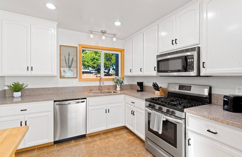 Step outside to your own private backyard oasis, where you can enjoy evenings under the stars in the bubbling hot tub, savor meals al fresco at the outdoor dining table, or gather around the fire pit to share stories and roast marshmallows. A grill is also provided, perfect for casual cookouts with friends and family. With accommodations for up to twelve guests, this home is ideal for multi-generational families, groups of friends, or anyone looking to experience San Diego in comfort and style.