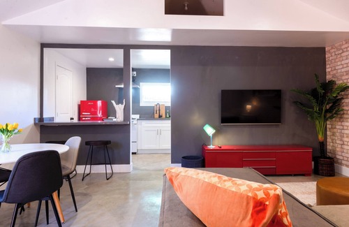 Private cozy guesthouse in Inglewood, minutes from So-Fi Stadium. Features a gated driveway leading to a standalone guesthouse with smooth concrete floors and an open-concept living room, smart TV, streaming, and high-speed Wi-Fi. Includes a Queen bed, fully equipped kitchen with stove, dishwasher, coffee/toaster station, and quartz bar seating. Beautiful bath with walk-in shower, natural light, vaulted ceilings, and a fan.