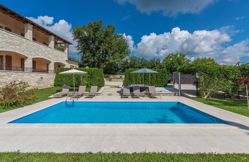 Holiday house with swimming pool, jacuzzi, fenced yard, BBQ, pets friendly. Villa Vernier is furnished with new, modern and high quality furniture. It is located on the edge of the village and surrounded by nature. It has 165 m2 over two floors and it is located on its own piece of land of 2000 mq. There is a fully equipped kitchen, living room with sofa-bed for two persons and an exit to terrace, a bedroom with a double bed and two bathrooms on the ground floor. On the first floor there are two bedrooms with double bed and air conditioning, each room with its own bathroom and a common terrace with a view at the pool and green hills. Features free, wireless Internet, air conditioning, satellite TV, towels and bed linen. The house has a large pool of 32 sqm with deck chairs and umbrellas, outdoor fireplace with grill and private parking (for 3 cars). Kringa is a small village just 3 km from the town of Tinjan-The Town of Istrian ham Tinjan is a small town in inland Istria, on the road connecting Poreč with Pazin. There are only 17 km from Poreč and the closest beaches as Zelena and Plava Laguna.