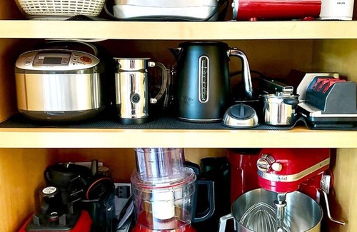 Full suite of small appliances including stand mixer, food processor, and rice cooker