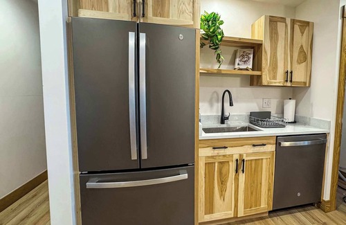 Inside, you’ll find an open living area with a cozy fireplace, a fully equipped kitchen stocked with cookware and extras, and all the comforts of home — including air conditioning, High Speed Fiber Wi-Fi, Smart TV equipped with Sling + popular streaming apps for guest login. Family-friendly touches like a bathtub, children’s dinnerware, outlet covers, and room-darkening shades make traveling with kids a breeze.