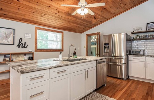 Get away from it all in our unique mountain home. Soaring two story living room with stunning stonework and beams is a fabulous gathering space. Step outside to our deck and enjoy the mountain air. Relax in the hot tub or around the firepit and roast some marshmallows or look for shooting stars.
