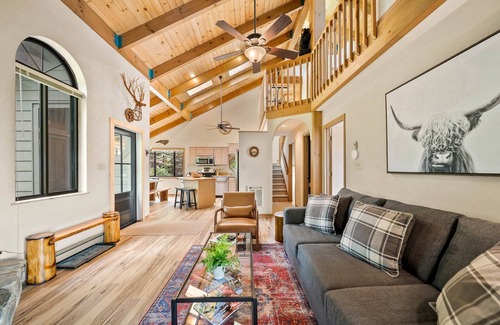 The main floor is an open-concept living room featuring soaring vaulted ceilings and exposed beams, a wood-burning fireplace, and an HD Smart TV. The living room is adjacent to the kitchen, which features granite countertops, stainless steel appliances, and a center island with a live-edge wood slab top. The dining area accommodates up to eight (8) guests. The den, located off the living room, provides a second area on the main level for relaxation and entertaining. It features many windows that allow natural light and provide a mountain view. The den has another HD Smart TV and ample comfy furniture. A sleeper sofa on the main level can sleep two (2) more guests. There is a hallway half bathroom on the main level as well.