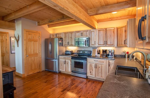 The main level of Bald Mtn Lodge features an open-concept great room, dining area, and kitchen with wood floors, vaulted, tongue-and-groove wood ceilings, and exposed beams. A huge wood-burning fireplace is centered in a stacked-stone wall with an HD Smart TV atop the mantle. Comfy leather furniture, additional seating, and reclaimed-wood coffee and side tables complete the great room. A wall of glass windows and doors opens up unobstructed layered mountain views, including Bald Mountain and Elk Ridge. Dine up to 10 guests comfortably at the banquet-style dining table with extension. Two more can sit at the adjacent kitchen island for a total of 12 seats. The kitchen features stainless appliances, granite counters, and hickory cabinets. A half bath/powder room is central and convenient, and the open-air deck spans the length of the house, wrapping around the side, features outdoor seating, a stainless gas grill, and an outdoor picnic dining table, all of which look out at the picturesque mountain views.