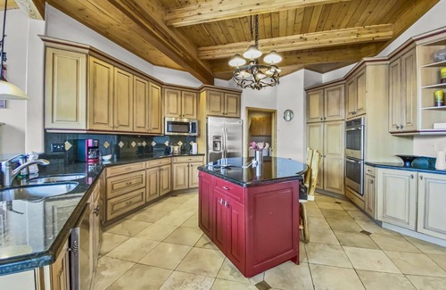 Gather in the view-filled living room (large TV + stone wood-burning fireplace) or cue up a movie in the home theater. The chef’s kitchen is fully equipped for big breakfasts and hearty après dinners; step onto the deck to grill and soak in the hot tub under the stars.