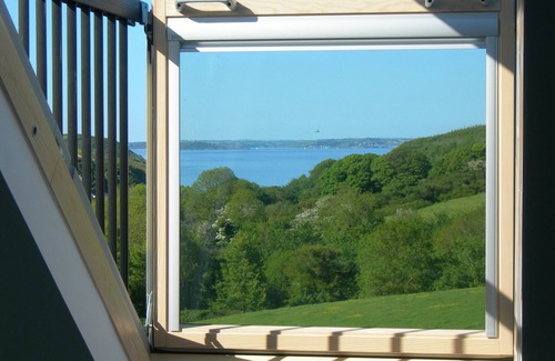 Nanteague is a quirky but luxury chalet-style cottage with beautiful sea views across a wooded valley to Falmouth Bay.