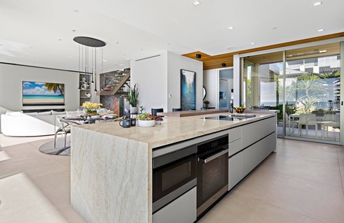 Enter through a private garden courtyard and into an open floor-plan living space filled with natural light with an ocean-blue backdrop. The ocean-view living area features a gorgeous custom u-shaped sectional, fronting a linear gas fireplace. The 75” flat-screen television with 5.1 surround sound delivers a cinematic experience and doubles as a piece of art when not in use. The sleek and stylish kitchen features a natural stone waterfall island with bar seating, where you or a personal chef can prepare gourmet meals utilizing the top-of-the-line Miele appliances, and then dine on the circular metal Aqua dining table with a teardrop Carrara marble base.