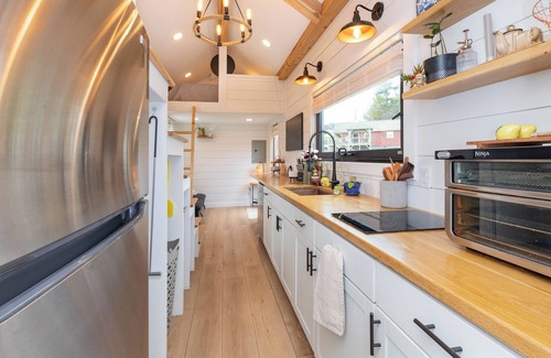 Your mountain getaway awaits at this quaint tiny home in Alexander. This tiny home on wheels was newly built in 2023, designed and built by the owners. This home includes 2 lofts, a cozy living space, a fully functional kitchen, and a well-equipped bathroom with a washer and dryer. This home has a patio deck and a full seasonal 100% organic garden. Please enjoy free WiFi, stream any needs on the Samsung Frame 43” TV, stargaze on the patio at night, and pick a basket of your favorite fruits and vegetables to take home (if in season, of course) during your stay. Cook in the kitchen and serve to guests by the campfire through our 5 ft awning window to the patio. You'll find this tiny home in a private cul-de-sac surrounded by the sweetest neighbors and community we have grown to love. This tiny home retreat is the perfect spot to recharge. Go hiking, visit downtown Asheville, or just enjoy brewery hopping. Find our reference guide for our local references. We love hosting! Welcome!