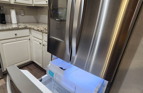 KITCHEN: Cooking essentials, microwave, refrigerator, stove/oven, dishwasher, K-Cup coffee maker, dish soap, sponge, towels