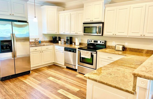 Enjoy our fully stocked kitchen featuring all the utensils and cookware you would need to channel your inner chef during your stay. The wine bar features a Keurig coffee maker, as well as a traditional coffee maker, a margarita blender, wine glasses and wine opener. The dining room table will comfortably seat 6 people, along with additional seating at the kitchen bar area. Take care of all your laundry with our washer/dryer, along with detergent, dryer sheets, etc. There is also an iron, ironing board, and luggage racks in the walk-in master closet for your convenience.