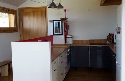 This cottage has just been completed has 2 levels. Upstairs living room, kitchen, a toilet and a bath + a mezzanine. On the ground floor, 3 bedrooms with a bathroom and a toilet. Large south-facing windows offer stunning views of the valley.