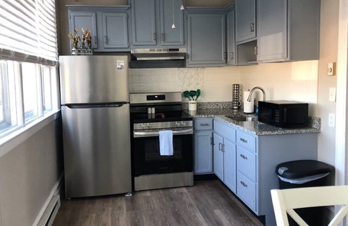 This space provides an inviting and comfortable living room - with ample seating and a large screen tv, it's the perfect spot for relaxing after a day of exploring. The living room sofa also provides a comfortable pullout queen sofa. The large bedroom has a king-size bed, along with a daybed, sitting area, a large screen tv and a laundry area with a full size washer and dryer. Enjoy meals in a bright kitchen, equipped with full size appliances, and windows overlooking the stunningly renovated officer homes and original polo field. The apartment also provides a large full bathroom, with tub/shower combo.