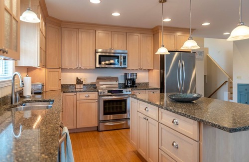 Spend your vacation in this inviting and spacious two bedroom, two bathroom split-level home. The first level is an open concept featuring a combined living, kitchen and eating area with a ductless split air conditioning unit. The kitchen features custom cabinetry, granite countertops and a large island, perfect for pancake breakfasts! The dining area seats six comfortably, or choose to eat outside on the patio, accessed easily from the sliding door. A bunk room perfect for the kids in your party, or young at heart, is off of the living area. In addition there is a full bathroom and laundry room. There is a staircase off the main level leading up to the primary bedroom with en-suite bathroom, private deck access and ductless split.