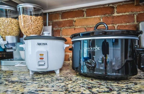 Free coffee, tea, oatmeal and cereal. Slow cooker and rice cooker provided.