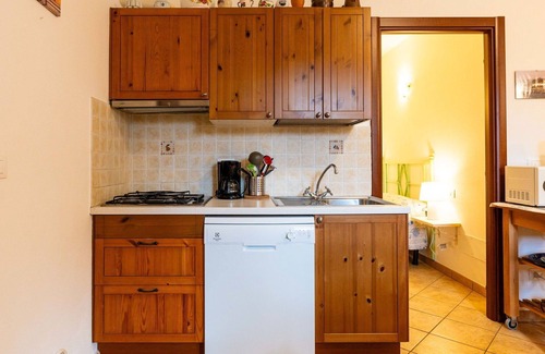 The apartment's kitchenette is well-equipped with a dishwasher, four gas rings, a toaster, a kettle, a microwave, and an electric coffee machine. It also has a shower, bidet, and a toilet. The heating system runs on gas and is available from November 1st to April 15th. Solar power is utilized for energy efficiency. Outside, there is a beautiful garden area with terrace furniture and a barbecue setup.