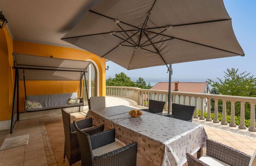 Spend an unforgettable vacation in this beautiful vacation home with private swimming pool near Opatija. The property is beautifully landscaped and offers plenty of greenery and a number of amenities such as pool, sun loungers, trampoline and table tennis table. Parking is located in the lower part of the property, from where you can access the house and garden via steps. Enjoy the outdoor hours on the terrace and the fantastic view of the sea and Kvarner Bay. The interiors are spacious, light-filled and air-conditioned. Interior stairs lead from the living area to the bedrooms and bathrooms.