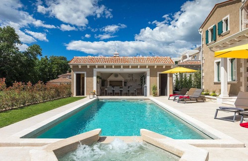The beautiful Villa Jakob is located in the small village of Gregi and can accommodate a total of 9 people in pleasant surroundings. It is decorated with stone details. Its design is a perfect blend of modern and traditional elements from this region. The interior of the villa is decorated with style and many beautiful details that give you a feeling of luxury. The villa is divided into first floor and second floor, on the first floor there is a living room, an equipped kitchen and a bedroom and a bathroom. On the second floor there are three bedrooms with three en-suite bathrooms and a covered terrace with a seating area where you can enjoy a refreshing drink. In the landscaped courtyard, the villa offers its guests a private pool and for additional relaxation there is a sauna. While sunbathing, you can enjoy the beautiful surroundings around the villa. Enjoy an evening meal with family and friends over a barbecue in the outdoor kitchen and spend unforgettable evenings that you are sure to remember for a long time to come. Book Villa Jakob for an idyllic vacation in Istria The beautiful Villa Jakob is surrounded by the greenery and idyllic nature of Istria. It is located in the small village of Gregi and offers its guests the opportunity to visit restaurants, cafes and supermarkets in the nearby village of Kringa, which is only a few kilometers away from the villa. Beautiful Istrian beaches extend to the western part of the Istrian peninsula. The nearest beach is located in Porec and is 18 km away from the villa. Visit the Istrian pearls, Rovinj and Porec, which are a 30-minute drive away. If you are a fan of adrenaline, you should definitely visit the Adrenaline Park in Kringa. Explore this beautiful area and we are sure you will fall in love with Istria.
