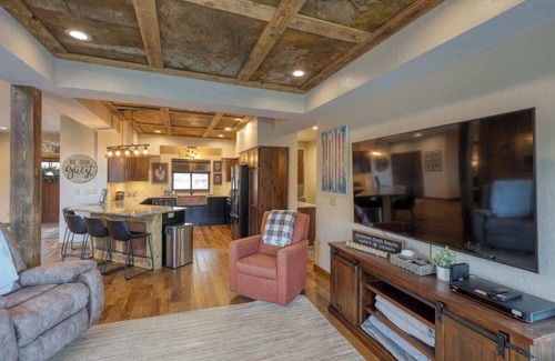 ■ Open-Concept Living Space: Large kitchen with modern appliances, dining area, and living room with flat screen TV.