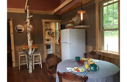 The cabin has one bedroom, one bathroom w/shower, a kitchen and a great room with a futon and a couch, so it sleeps 4-5 guests. The cabin is equipped with most everything you should need. It has a fully stocked kitchen with dinnerware, pots and pans, utensils and cookware. We provide a variety of breakfast items, such as coffee, tea, juice, yogurt, cereal, muffins, and even pancake mix, but you can bring whatever you like to cook. There is a gas stove, refrigerator, sink, microwave, toaster, blender, and a coffee maker.
