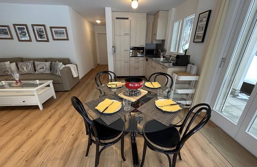 55 m2. More information by the provider: Very bright 2 room apartment, freshly renovated fall 2024 (all walls, floors, new bathroom and new bedroom furnishings) on the first floor of an apartment building with 6 apartments in the quiet Oberberg quarter. 2-3 minutes walk from the Langacher winter bus station. A 15-20 minute walk from the village (flat). Large garden seating area on 2 sides of the house with table and chairs. Entrée with large wardrobe. Bright, cozy living-dining room with sofa bed (140 cm), TV, Wifiand open kitchen with dishwasher, Delizio coffee machine, kettle, egg stove, microwave, raclette and fondue set. Large bedroom with wide bed (180 cm, 2 mattresses). New, modern bathroom with walk-in shower and additional rain shower. Hair dryer. Indoor parking with garage space and ski storage room. Bicycle parking. Outside parking lot. Washing machine and tumble dryer available. Strictly NON-SMOKING-APARTMENT. No pets allowed.