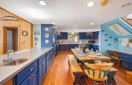 You’ll love the main floor’s open kitchen with nautical décor and plenty of seating. Off the kitchen there are three cozy bedrooms (one being a master suite with King bed) and an additional den with a TV, books, games, and puzzles for family fun. The second floor has two more bedrooms including a second master suite featuring a King bed, private bathroom, and amazing views. With ample living space, this home is just right for multi-generational stays! Everything you need for outdoor dining is here. Relax on the enclosed patio with a gas grill, extra seating or enjoy the back deck overlooking the water.