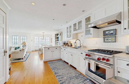 Begin each day in the open kitchen, dining space, and living room, where you can take off the morning chill by throwing a log on the fireplace, admire the sunrise views of the coast through walls of windows, and sit down for pancakes prepared on the professional-grade gas range. Whether you're booked for a kayaking trip or a whale-watching excursion for the day, you'll come home to a gorgeous oceanfront deck where you can soak up in the sunshine in a rocking chair or enjoy an al fresco lunch of local lobster rolls. In the evenings, scroll through the Netflix and cable offerings on the living room TV or in the cozy upstairs media room as the day's clothes spin in the washer/dryer. When it's time to turn in, you'll have your choice of three charming queen bedrooms (one downstairs and two upstairs) in the main house, as well as a crow's nest loft that makes kids feel as though they're the captain of their own ship. In the separate guesthouse, you'll find a kitchenette and large picture windows that frame the ocean just outside.