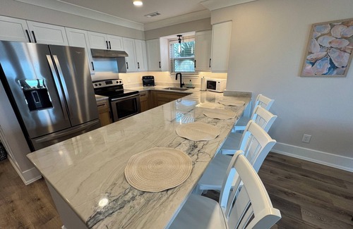 Both upstairs suites share a gorgeous sea glass marble wet bar, ideal for morning coffee or evening cocktails. A stackable washer and dryer are also available for your convenience.