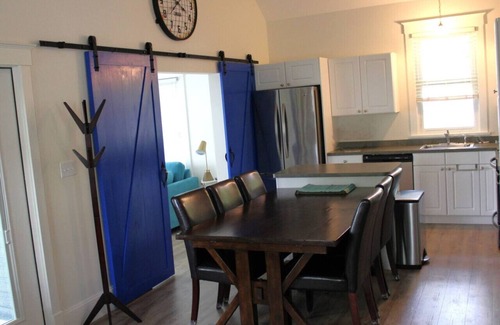 The open-concept living, dining, and kitchen area is bright and welcoming, enhanced by vaulted ceilings. The well-equipped kitchen offers all the modern amenities you need, including four stainless steel appliances. Unwind in the living room, where each space, including the bedrooms, is outfitted with a 40` flat-screen TV featuring Roku Streaming and digital cable. A spacious 4-piece main bathroom includes a washer and dryer for added convenience.