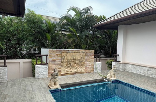 The house wraps around a private pool. Enjoy the convenience of amenities like WiFi, AC, full kitchen, and a washing machine. This is a great place for couples or small families to relax in Hua Hin. The main town is 15 mins away.