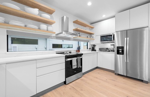 Kitchen: Stainless steel refrigerator with water/ice dispenser, stove/oven, dishwasher, microwave, toaster oven, drip coffee maker, and blender. Basic dishes, cookware, and utensils are provided. Basic spices, cooking oil, and coffee filters and/or pods are not always available.