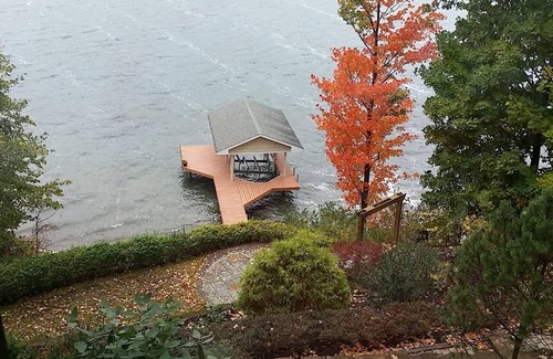 The 200 feet wide, level lake frontage is perfect to relax and enjoy the lake. It is easily accessible from the house. At lake level there is a dock provided for your use where you can tie up a boat, go swimming, or relax in a lounge chair with a glass of wine and enjoy the views. **Please note- if you would like to grill food during your stay, please bring charcoal etc. As we do not provide this item.**