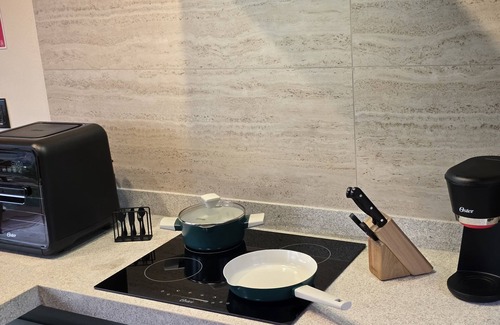 This 1-bedroom, 1-bathroom rental features a fireplace and a water dispenser. Bathroom amenities include a hair dryer, towels, and toilet paper. The kitchen is equipped with an oven, a stovetop, and a refrigerator, as well as a coffee maker, a microwave, and cookware.
