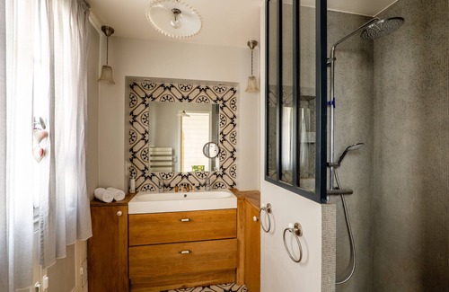 Contemporary in style with striking geometric tiling, the en-suite bathroom offers a spacious walk-in shower and wash basin. A separate WC can also be found in the apartment.