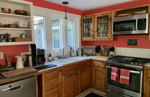 A charming cape-style home in beautiful Midcoast Maine. 2 bedroom, 2 full bathrooms. Lots of natural light in spacious living areas. Freshly renovated and painted, with wood floors and brick fireplace. Sweet, cozy bedrooms with comfy new mattresses and linens (1 Queen, 1 Full). Plenty of closet space. Fully-equipped kitchen with everything you need if you love to cook. Strong wifi great for streaming, plus big-screen Roku TV in the den, and a cute office if you need to do some work from home.