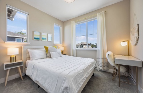 Upstairs Primary Bedroom with luxury pillow-top king bed, comfy luxury linens and large walk-in closet. Features a desk and gorgeous en-suite bath with Marble shower. Two additional lovely Guest Bedrooms are light filled with lively decor, a desk in each, pillow top full bed, comfy linens plus beautiful shared bath w/ tub ~ Bubbles, candles & ambiance await!