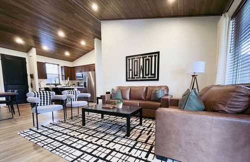 The open-concept kitchen features stainless steel appliances, farmhouse sink, and everything you need for home-cooked meals. Enjoy coffee at the breakfast bar or gather for dinner around the dining table. In the living area, unwind by the stunning stone fireplace, stream your favorite shows, or play board games together—every detail invites relaxation.