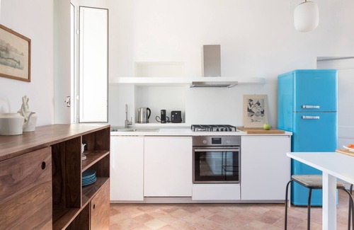 Dine al fresco on the sunny terrace with the city center skyline as a backdrop, including many of Rome’s most famous monuments. The apartment has a spacious open concept and has been newly decorated with a calming blue, gray, and pink palette.